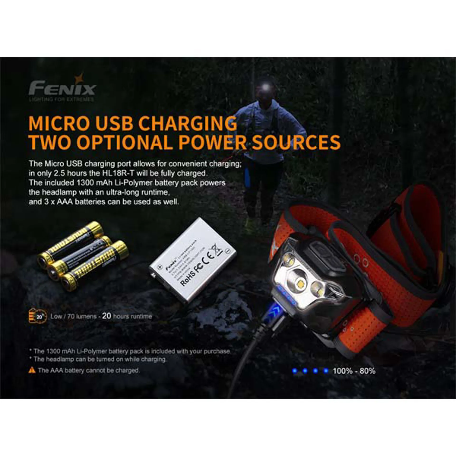 Includes:Fenix ARB-LP1300 Li-polymer battery pack, micro USB charging cable.