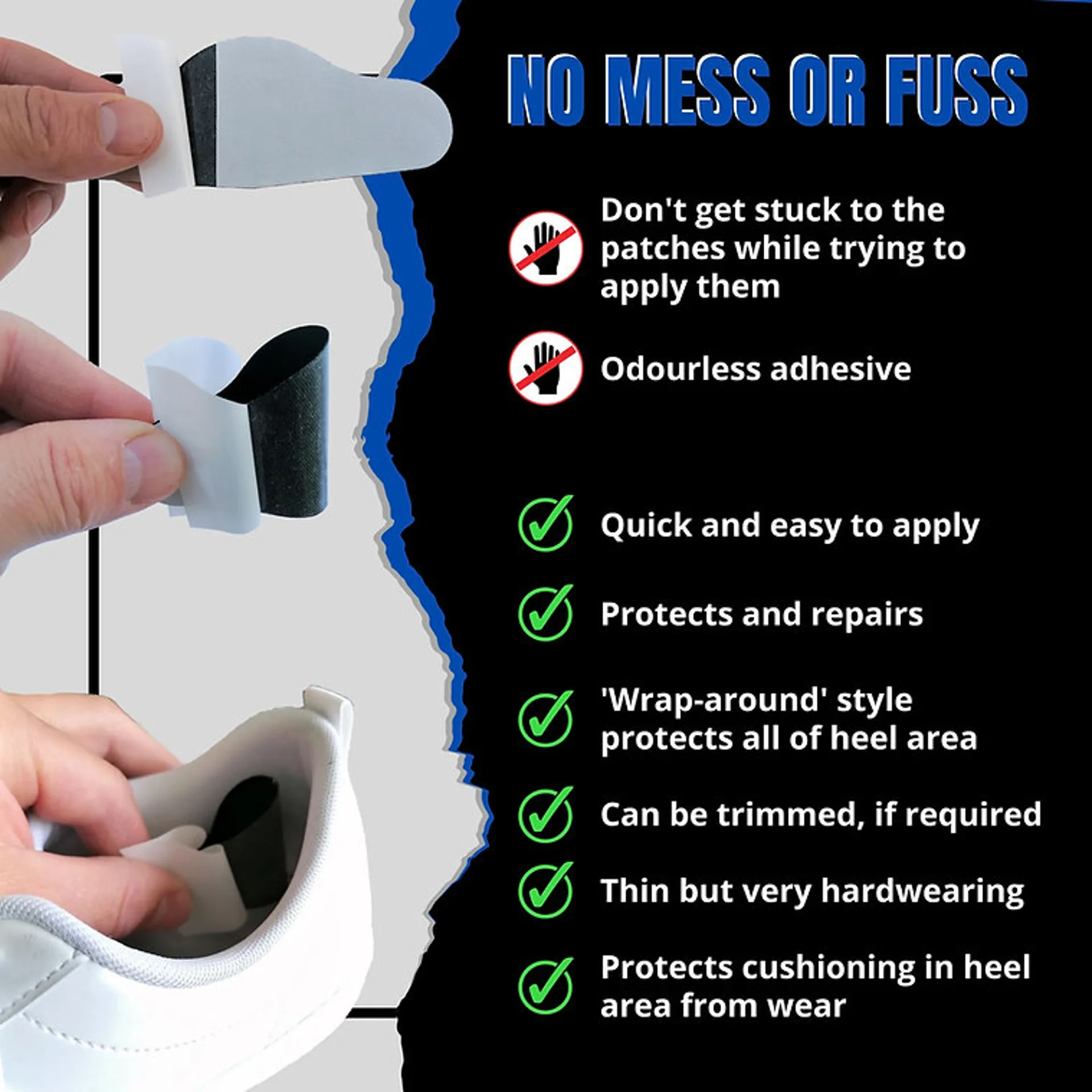QUICK AND EASY TO FIT:The Trainer Armour patches can be fitted without any mess or fuss: 1 – The thoughtfully designed backing ensures you don’t get your fingers stuck to the adhesive. 2 – The design allows for accurate placement of patch in heel area.