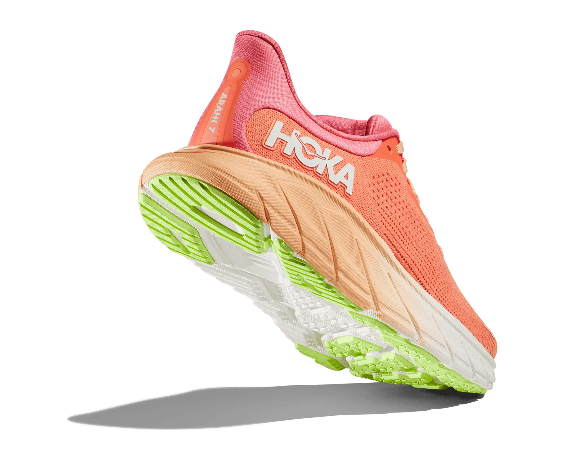 The new Arahi 7 delivers the same streamlined support as its predecessor with the Hoka J-FRME technology through the midsole. An updated zonally engineered knit upper has improved the lock-down fit through the mid-foot, and a fine0tuned fit through a plusher tongue and stretchy dual gusseted tongue beneath the lace line to limit tongue migration and irritation on the top of the foot.